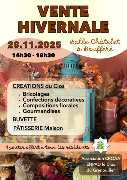 L’association CROAA et l’EHPAD le Clos du Grenouiller préparent leur marché hivernal le vendredi 28 novembre 2025 de 14h30 à 18h30, salle Châtelet à Boufféré MONTAIGU-VENDEE.