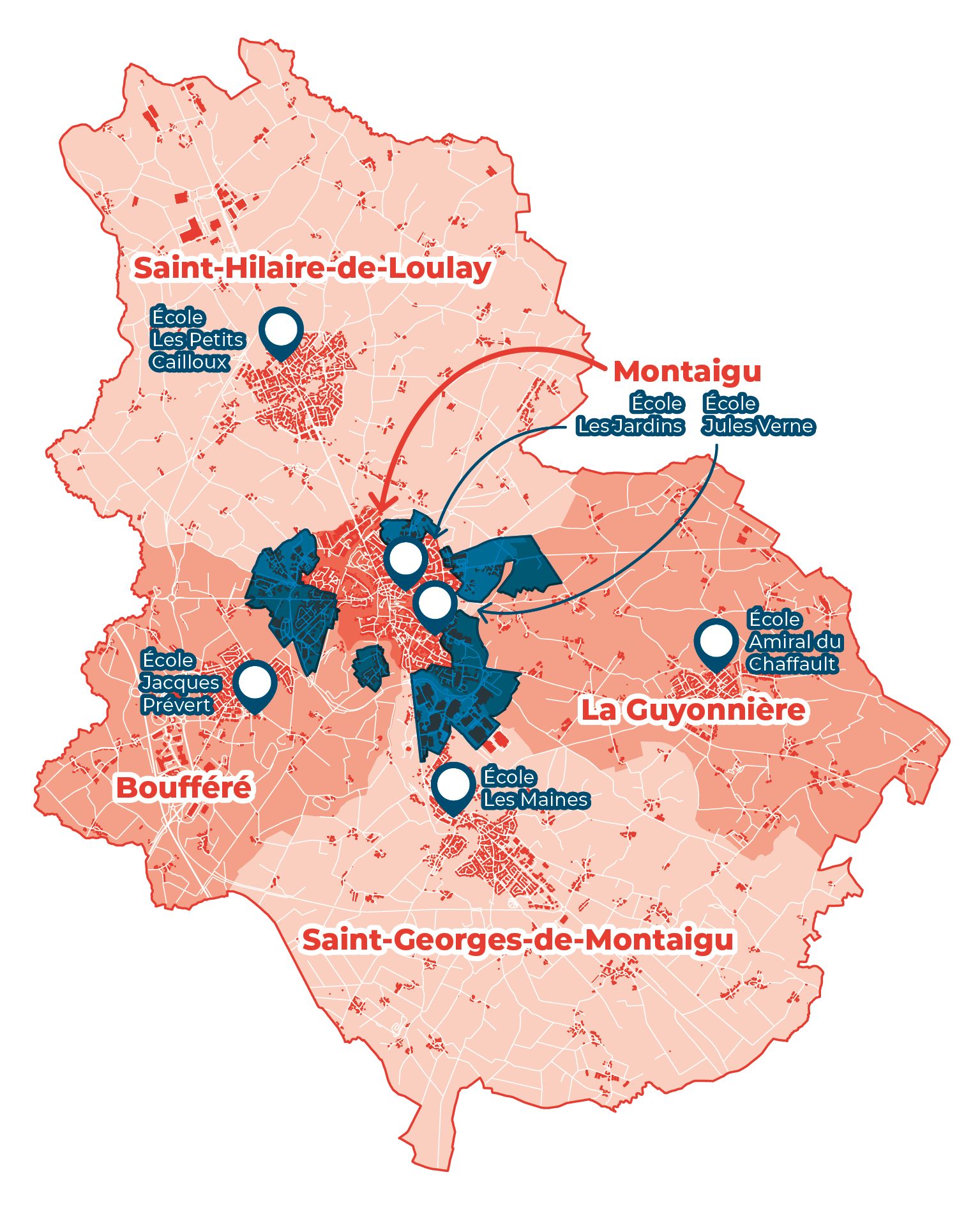 | SAINT-GEORGES-DE-MONTAIGU | Chassereau | École primaire Les Maines OU École primaire Jules Verne OU École primaire Les Jardins |